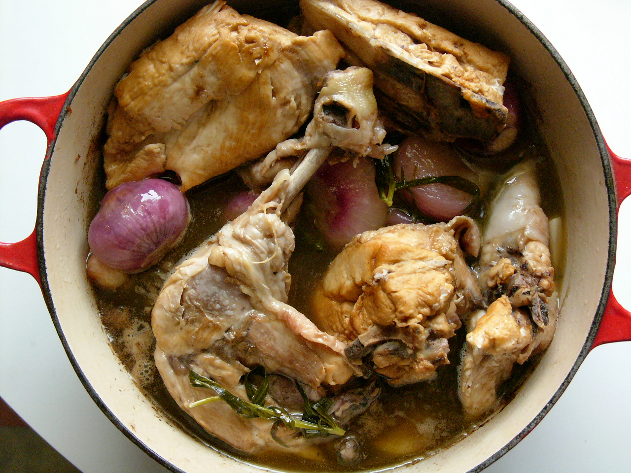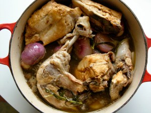 5. Next, tip the shallots and garlic in the large saucepan with the chicken, add the tarragon (if you’re using it), sherry vinegar and sherry. Put it over a medium heat and bring it up to a simmer then lower the heat slightly (the liquid should be lightly, not ferociously bubbling) and leave it for about twenty minutes.