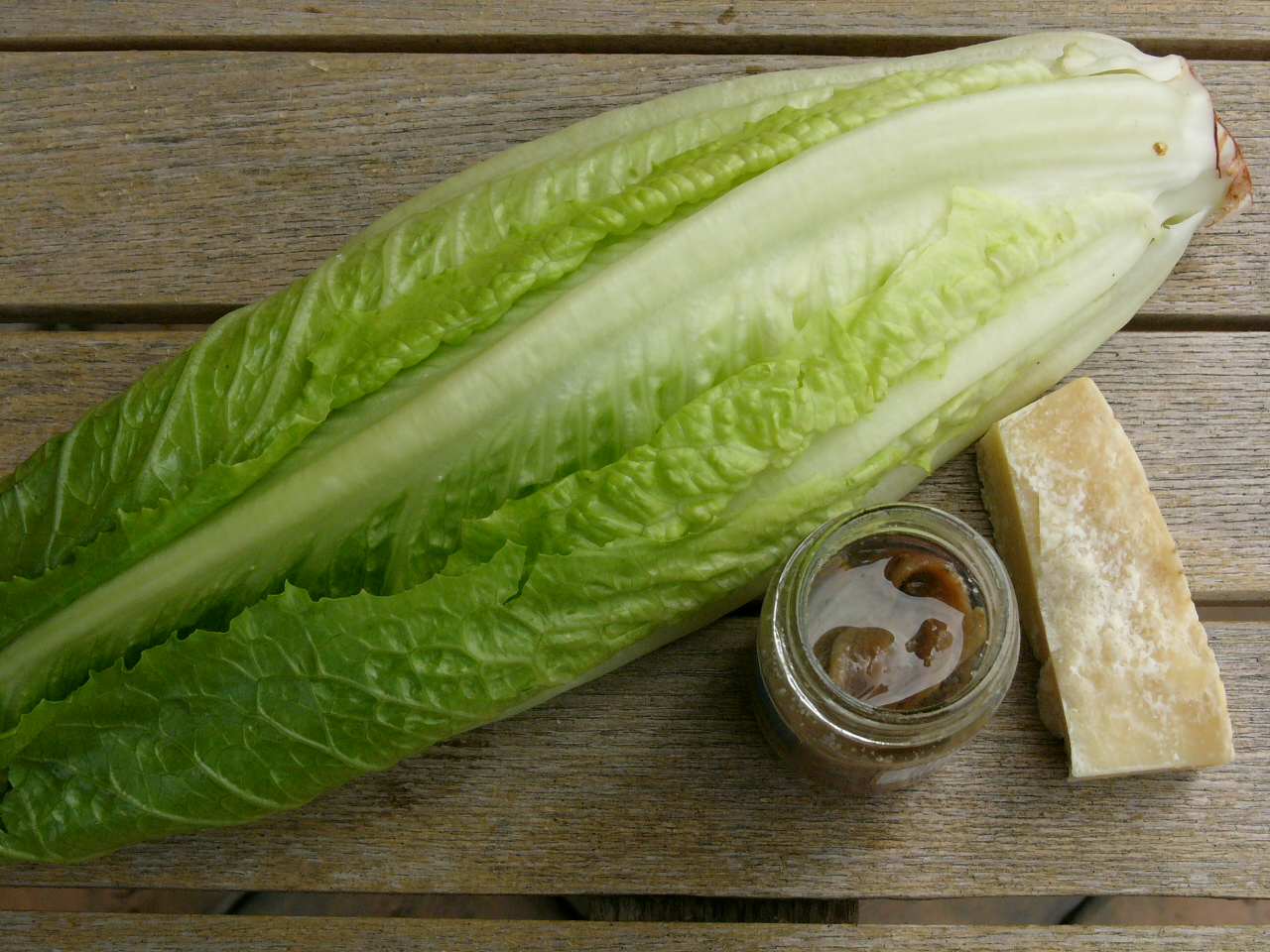 On day two of the fridge-emptying exercise I decided to use up the roasted chicken. Whereas a packet of feta will last a lifetime, or near as dammit, a rotisserie bird, even from a reliable supermarket like Waitrose, isn’t quite so forgiving. And, since I also have some romaine lettuce (long-leaved and crunchy), Parmesan, anchovies, stale bread and, what’s more, it’s still madly sunny in London, well, Caesar salad was the obvious choice.