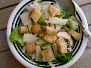 5. Put the salad leaves in a bowl, sprinkle over some Parmesan shavings (which means bits cut randomly from the block rather than anything too neat) then add the chopped cooked chicken and croutons. Finally, pour over the dressing and toss the lot together.