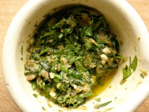 I wanted to make a chicken with feta dish; however, the herbs, which I bought at the weekend, are starting to look a bit limp so I need to use those up first. And salsa verde, I discover after a recce through my cookbooks, is the perfect solution, especially since I can throw in some anchovies, capers and that last half a lemon as well. I have never made it before but apparently it’s great with grilled fish and chicken. I had mint in the fridge so I used that with the basil and parsley but opinions differ on whether it’s necessary.