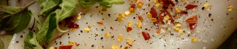 4. When the oil is hot put the squid into it, turning it to coat both sides in the oil, sprinkle it with the chilli, half a lemon’s worth of juice and the oregano (if using) and some salt and pepper.