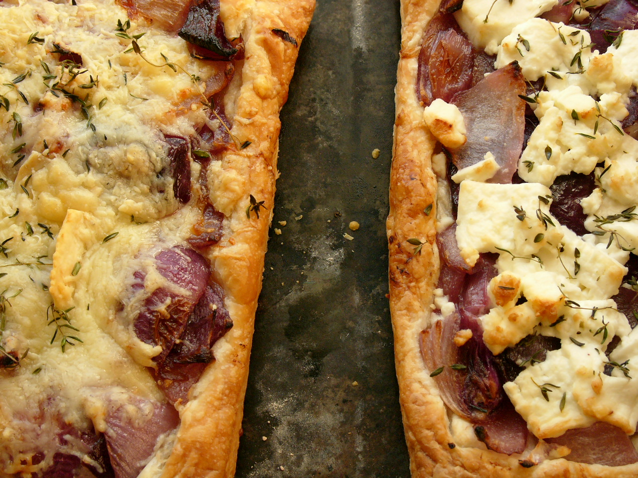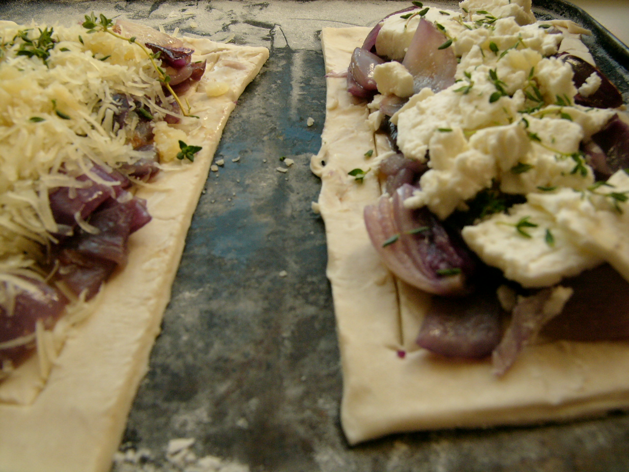 6. When the onions are done, put them on the centre of the pastry rectangle (inside the scored line), top with the cheese (and thyme if available) and bake for about 12-15 minutes. Delish on its own, with salad or taken in a sandwich box for lunch.