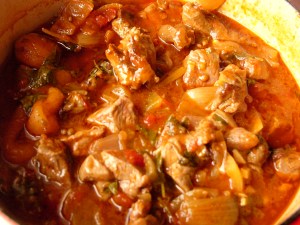 5. When the meat is done, pour out the fat but leave any scraps of meat, add a couple of tablespoons more oil then add the olives and garlic and fry them a little until soft (usually a couple of minutes).