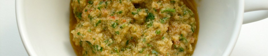 I think this is one of those recipes that is going to change my life, at least my cooking life. It is a pesto that is much more accessible year-round than the classic alla genovese, mainly because it is very store-cupboard-friendly, since it doesn’t require half a ton of some relatively delicate leaf and it seems so versatile. Use it as a dip, whether with some grilled spring onions or some bread, on grilled or baked fish (I think it would go with the white and oily varieties) and, most obviously as a sauce for pasta or gnocchi. You’ll need either a blender/food processor or a pestle and mortar and lots of energy. Oh, and if you were wondering, it’s pronounced salbi-tch-ada (thanks to my Catalan-speaking friend Bartley for advice on the ‘x’).