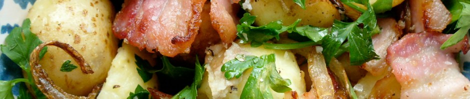 There are ten days of August left and, though it’s not my favourite month, it is still summer. So I am going to spend these almost-two-weeks squeezing in as many warm weather flavours as I can find. First, a hot new potato salad from delicious magazine that lives up to its origin. I’ve become a real fan of mayo-free new potatoes this year and, although this uses both a saucepan and a frying pan (as opposed to just a saucepan for most potato salads) it’s worth it. And, with only four main ingredients (potatoes, bacon, onions, parsley) this is a perfect standby for one of those haven’t-got-anything-to-cook panics. Okay, you might not have parsley in those circumstances but I think it would still be lovely without it. The magazine suggests that this would serve six as part of a barbecue but, since 500g is only eight or so medium new potatoes, I’d say that was an over-generous estimate. I think it’s probably enough for two large portions as a main or four as a side dish.