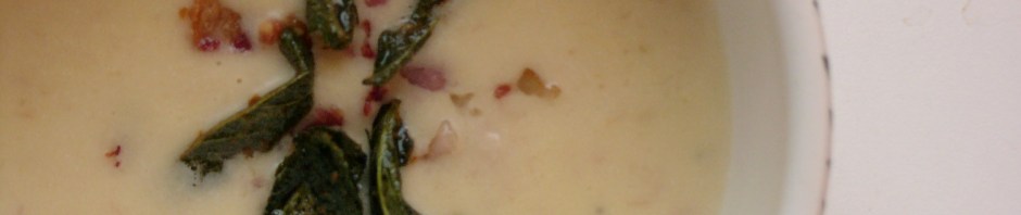 6. Finally, blend the soup until smooth, season to taste and add some cream/crème fraîche if you want. Reheat gently then serve with the crispy bacon and sage sprinkled on top.