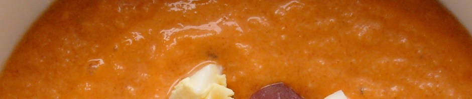 This is another Claudia Roden recipe from my trip to Ballymaloe but I first had it many years ago in Córdoba. I remember not being overwhelmed by it then, probably being loyal to the ‘greener’ taste of gazpacho, but when I tried it again in, ironically, Cork I was converted, especially since the recipe is even easier than my one for gazpacho. Make (or even buy…) breadcrumbs, shove all in blender, season; my sort of recipe. In fact the hardest part of this is the garnish: hard-boiling some eggs and finding a shop willing/able to cut a thick, rather than the usual thin, slice of jamón serrano. Don’t be put off by the lurid orange colour; it tastes much much better than it looks. And, if you are a cold-soup-naysayer, try it in small doses: I served it in shot glasses at the last wine-tasting and even though it was still, in June, a night for socks and fleeces, it was devoured.