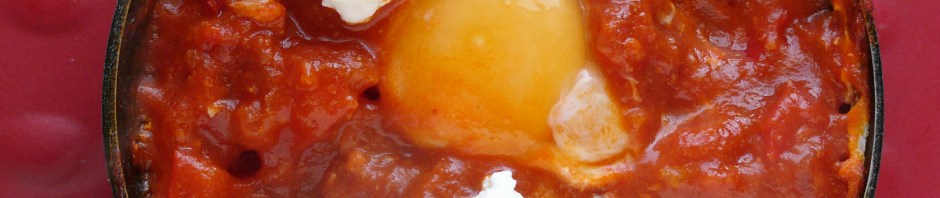 5. Make four dips in the sauce and break an egg into each one. Swirl the egg white into the sauce a bit, to help them cook, being careful not to break the yolks. Simmer until the eggs are done (runny yolks are what you’re after but, if you prefer, you can obviously cook them longer), covering with the pan lid if you want to speed this up. You can also, according to Lebovitz, bake them in the oven but I’ve not tried that yet.