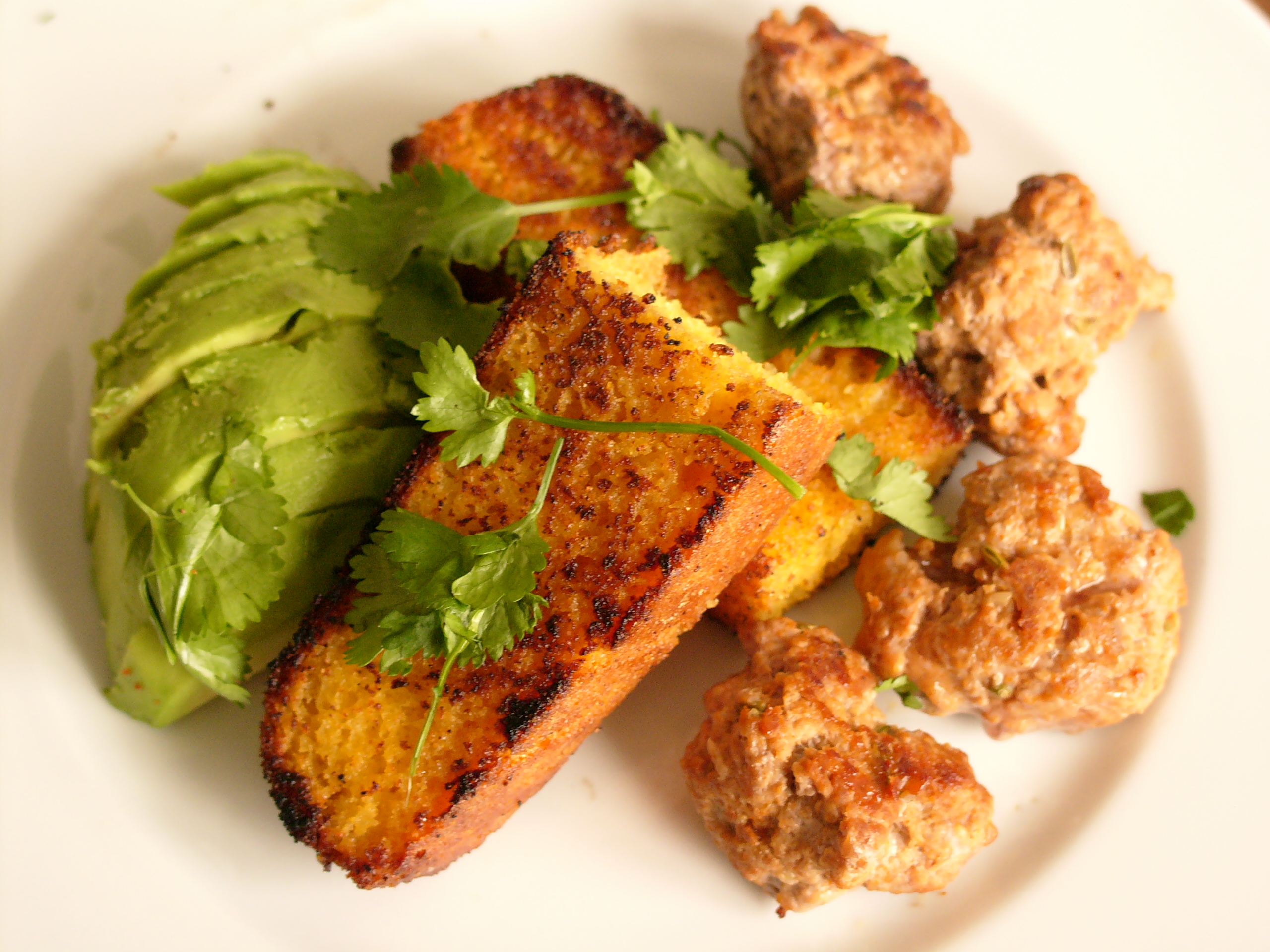 This is easy, and cheap (284ml of buttermilk will set you back 50p or so, a 500g bag of coarse cornmeal, about 70p and you need half of that) and one of the most delicious things ever: have it warm straight from the oven, toast it as you would any other bread and spread with cold butter or fry it in warm butter and serve it for breakfast, as I did, adapting the Waitrose recipe, with some of this homemade chorizo, a little sliced avocado and a sprinkle of fresh coriander.
