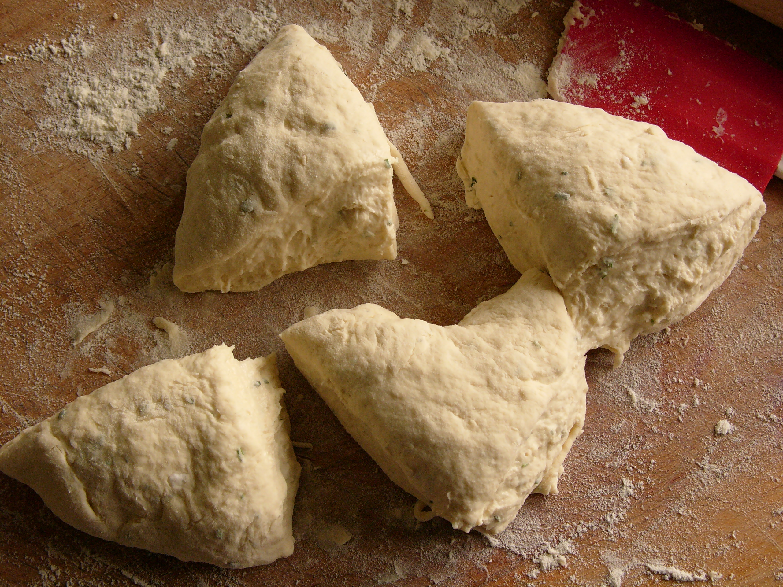 1. Finely chop the herbs. Put them in a bowl with the flour, baking powder, salt and yogurt and mix together until you have a dough that comes together, but is still quite sticky. (I have done this by hand and in a mixer; both work equally well).